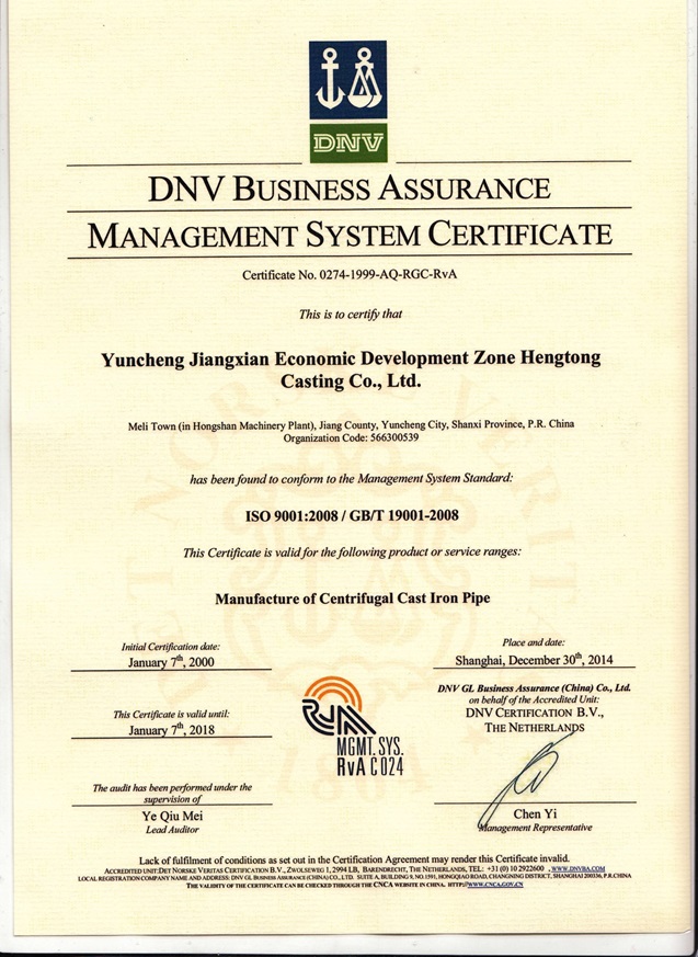 公司于2000年元月份通過了由挪威船級社主持審核的ISO9002質(zhì)量體系認證,2011年又成功通過了轉(zhuǎn)標換版:ISO9001:2008。產(chǎn)品相繼通過了美國UPC、加拿大CSA、馬來西亞SIRIM產(chǎn)品認證?,F(xiàn)有生產(chǎn)能力各類標準離心鑄鐵管三萬噸,產(chǎn)品質(zhì)量高,企業(yè)信譽好,產(chǎn)品已出口美國、加拿大、德國、馬來西亞等國家和地區(qū),是曲沃縣的出口利稅大戶。
